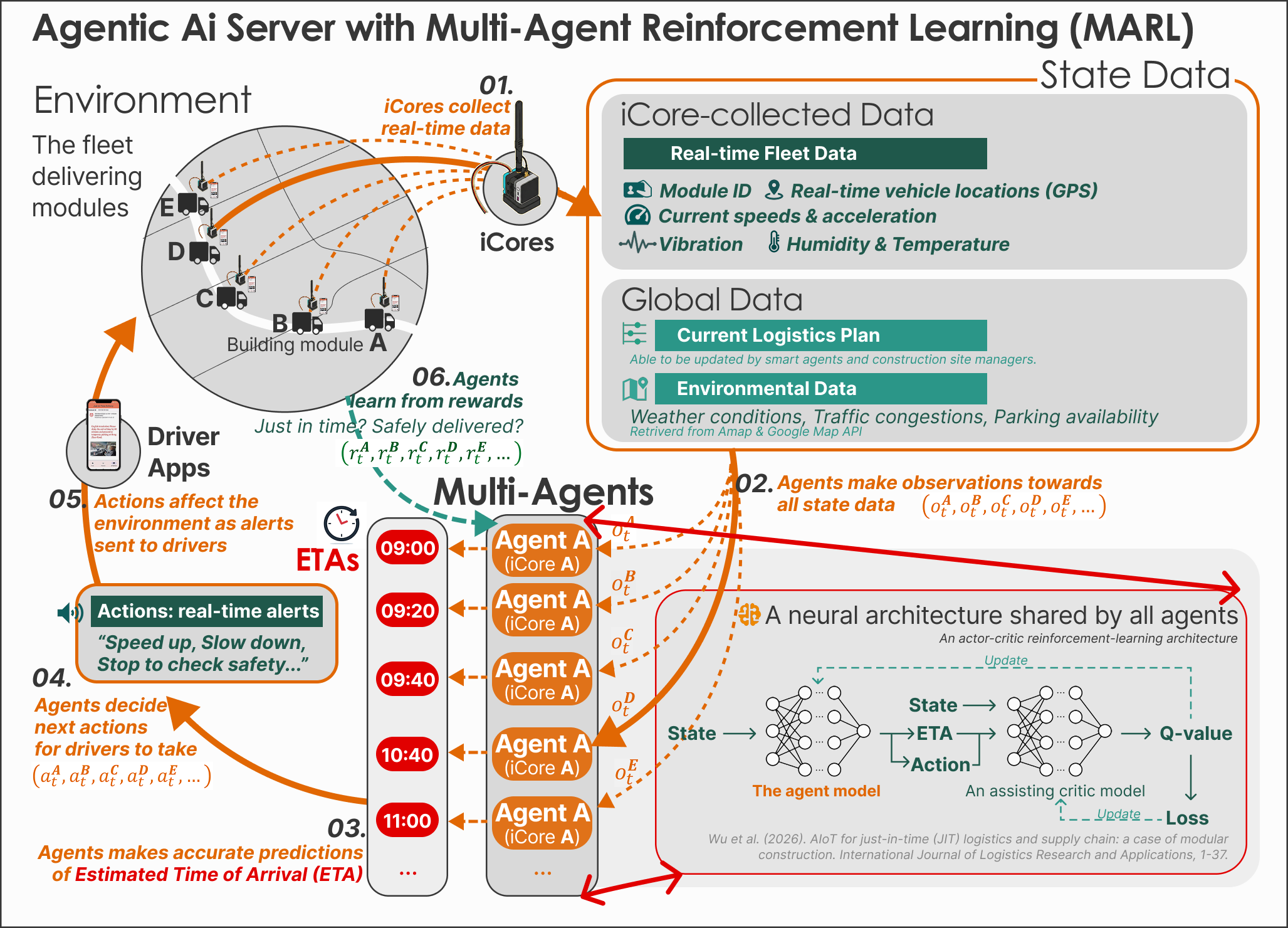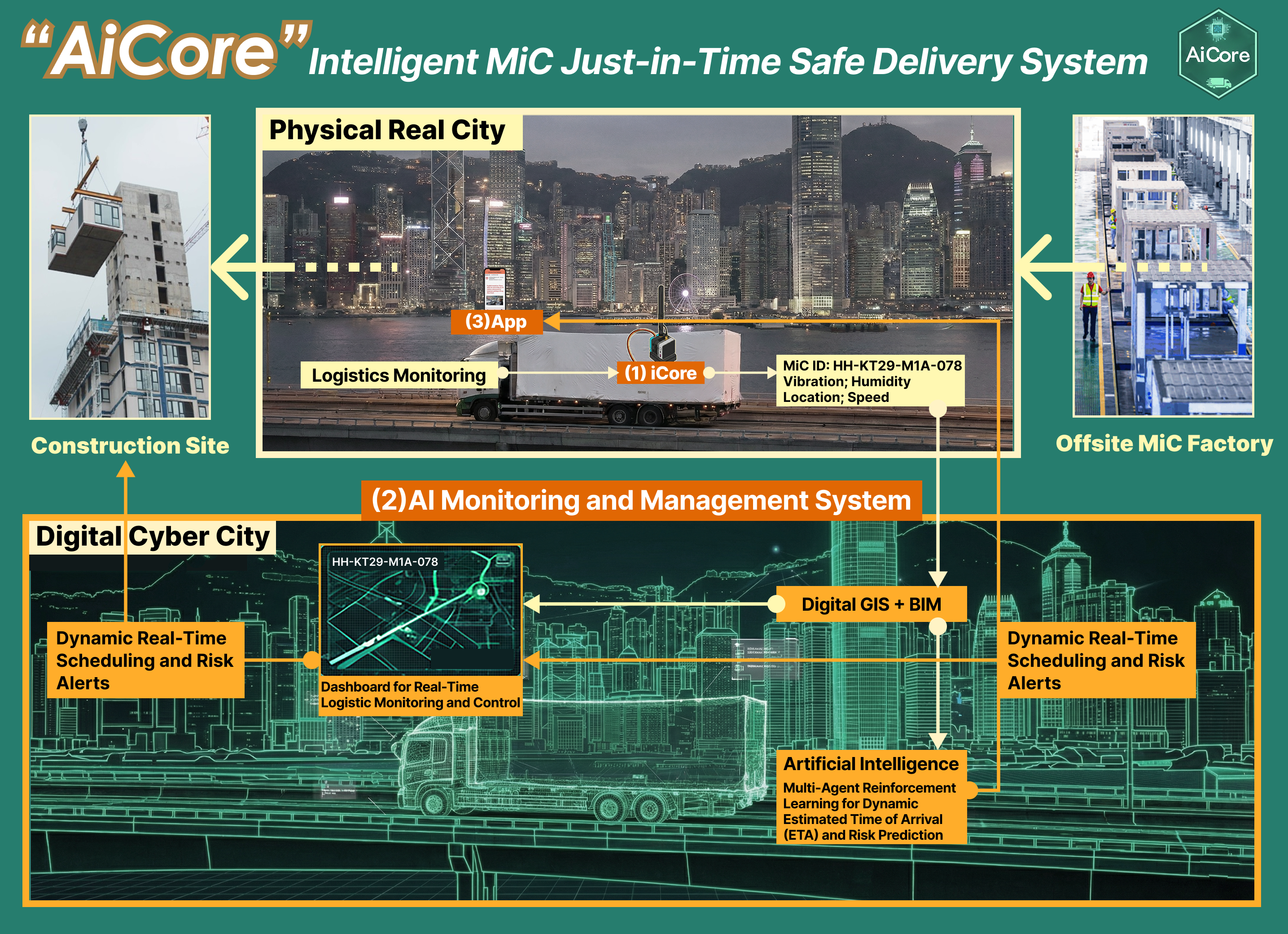 To address these problems, we invented the AiCore System, which integrates our iCore, an IoT with sensors, with our Agentic AI server to form a digital twin for real-time scheduling and transport monitoring of prefabricated building modules for Just-In-Time, orderly, and safe delivery from offsite factories to construction sites.